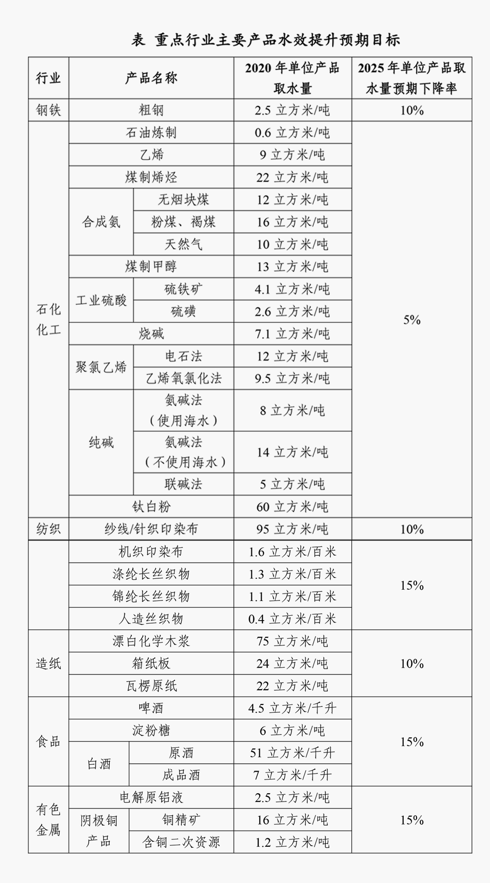 重點用水行業(yè)水效進一步提升,鋼鐵行業(yè)噸鋼取水量、造紙行業(yè)主要產品單位取水量下降10%,石化化工行業(yè)主要產品單位取水量下降5%,紡織、食品、有色金屬行業(yè)主要產品單位取水量下降15%。