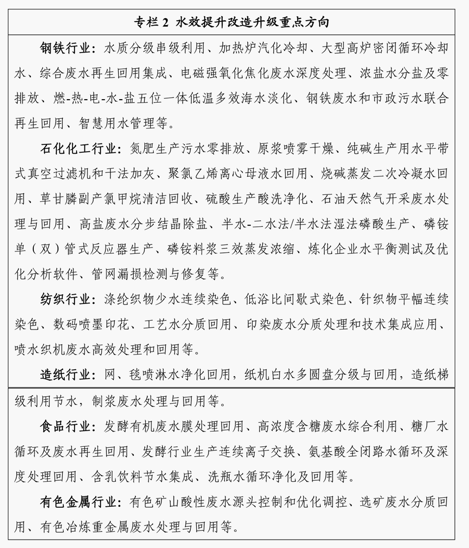 《行動計劃》在強化開源節(jié)流,優(yōu)化工業(yè)用水結構方面,指出聚焦廢水排放量大、改造條件相對成熟、示范帶動作用明顯的鋼鐵、石化化工、紡織、造紙、食品、有色金屬等重點行業(yè),優(yōu)先選擇水效領跑者企業(yè)、綠色工廠、綠色工業(yè)園區(qū)、新型工業(yè)化示范基地,穩(wěn)步推進廢水循環(huán)利用改造升級,創(chuàng)建一批廢水循環(huán)利用示范企業(yè)、園區(qū),提升水重復利用率。