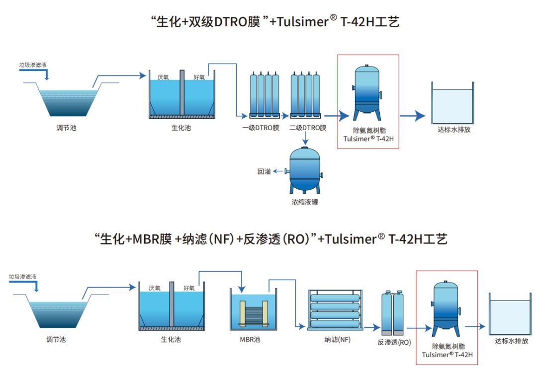 科海思深耕垃圾滲濾液行業(yè)難點(diǎn)、痛點(diǎn),基于Tulsimer ?T-42H特種除氨氮樹脂的特性,與現(xiàn)有膜處理工藝完美結(jié)合,提出了膜后出水氨氮深度處理解決方案。